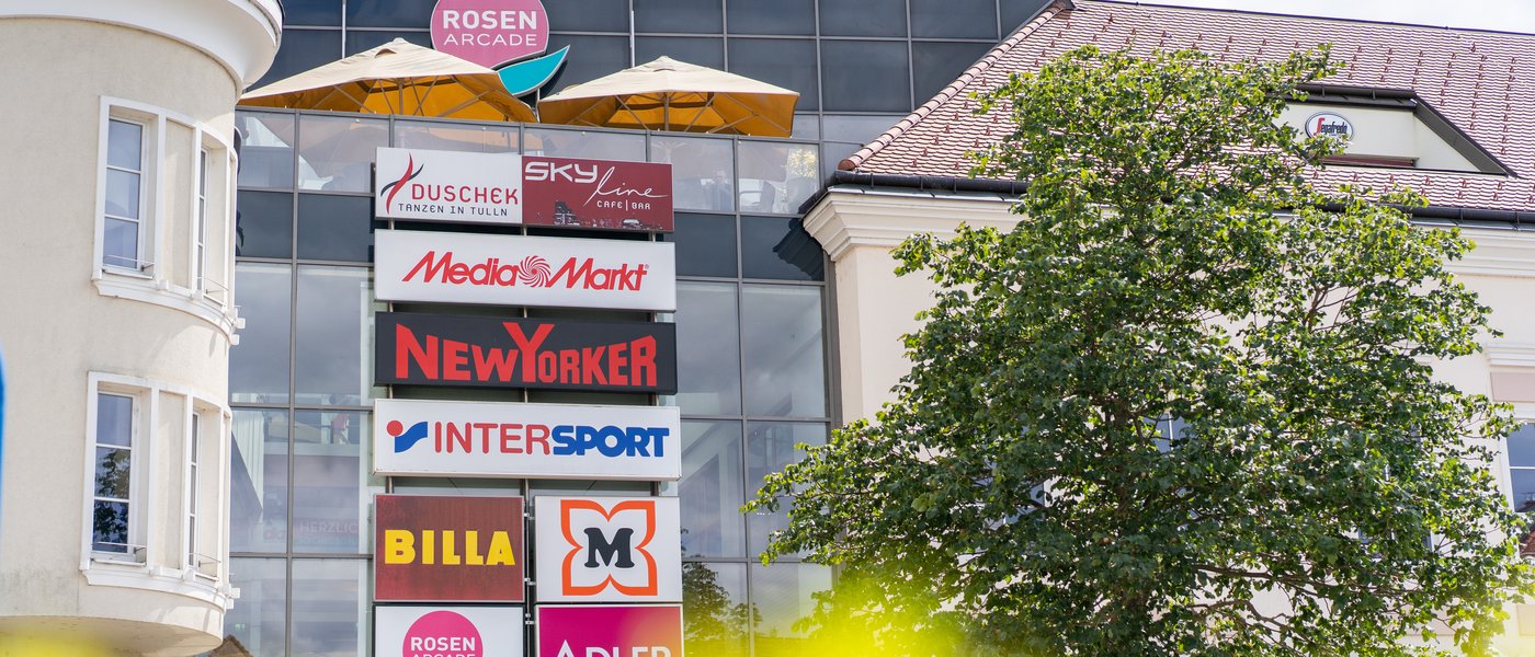 Ob Mode, Technik, Drogerie, Sport oder Lifestyle – die Rosenarcade bietet auf rund 16.000 m² Verkaufsfläche ein breites Spektrum an Marken und Services. Zu den Favoriten bei den Besucher:innen zählen dabei Shops wie MediaMarkt, Müller, dm Drogeriemarkt, Ernsting’s family, Intersport Winninger, Humanic, Thalia, Billa, New Yorker und zahlreiche weitere Anbieter:innen. Ergänzt wird das Angebot durch lokale Fachgeschäfte und Dienstleister:innen, die das Center zu einem wichtigen Nahversorger und Wirtschaftsfaktor für die gesamte Region machen. Die strategisch gute Verkehrslage mitten in Tulln – direkt am Hauptplatz gelegen – macht die Rosenarcade sowohl für Fußgänger:innen als auch für Autofahrer:innen und Benutzer:innen öffentlicher Verkehrsmittel sehr gut erreichbar. Ein weiterer Pluspunkt ist die Bahnhofsnähe. Sowohl aus Wien als auch aus St. Pölten kommen Besucher:innen rasch und bequem in die Rosenarcade. Über 700 überdachte Parkplätze und 30 Minuten Gratis-Parken sorgen zusätzlich für Komfort.